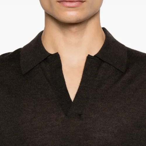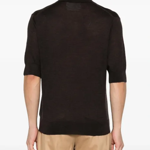 коричневая рубашка с V-образным вырезом, короткими рукавами и отложным воротником