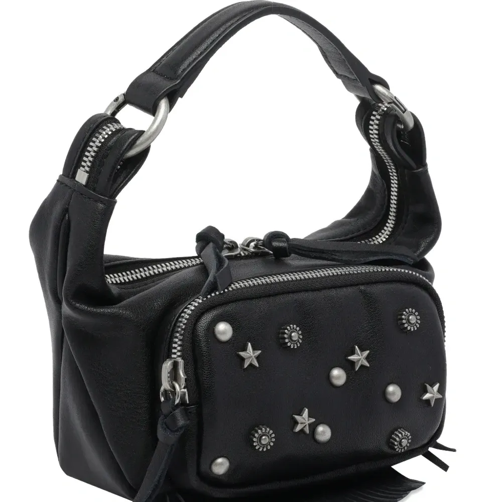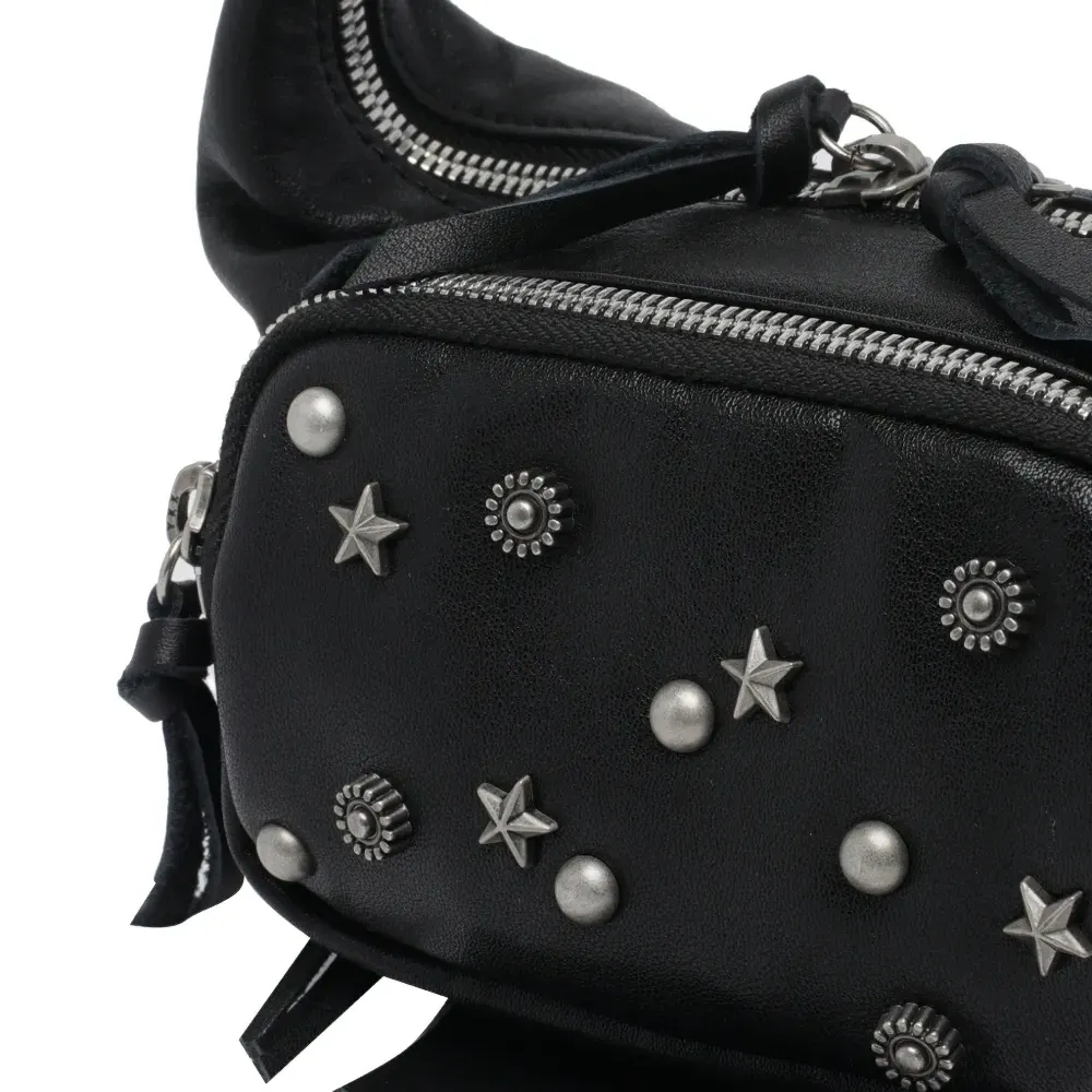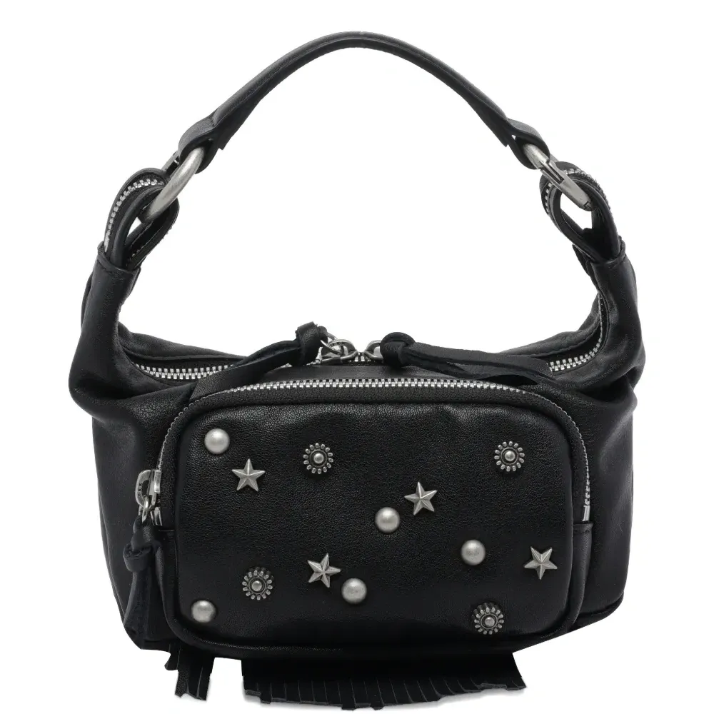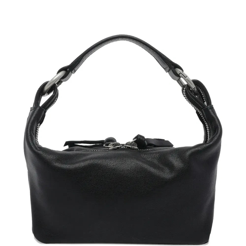 черная телячья кожа, декоративные элементы, застежка-молния, внешний карман на молнии, верхняя ручка