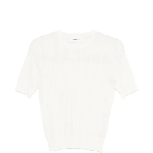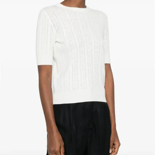 сливочно-белая открытая вязка, короткие рукава, круглый вырез, ребристый нижний край, ребристые манжеты