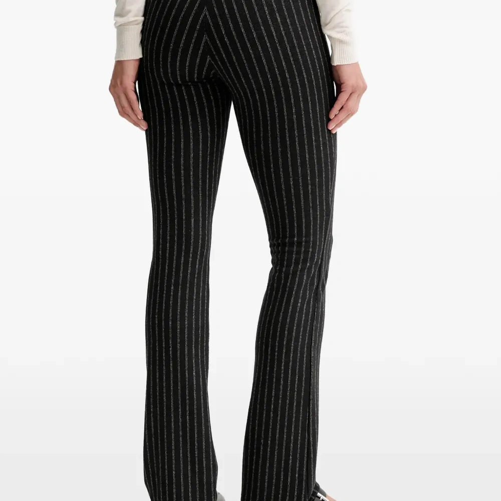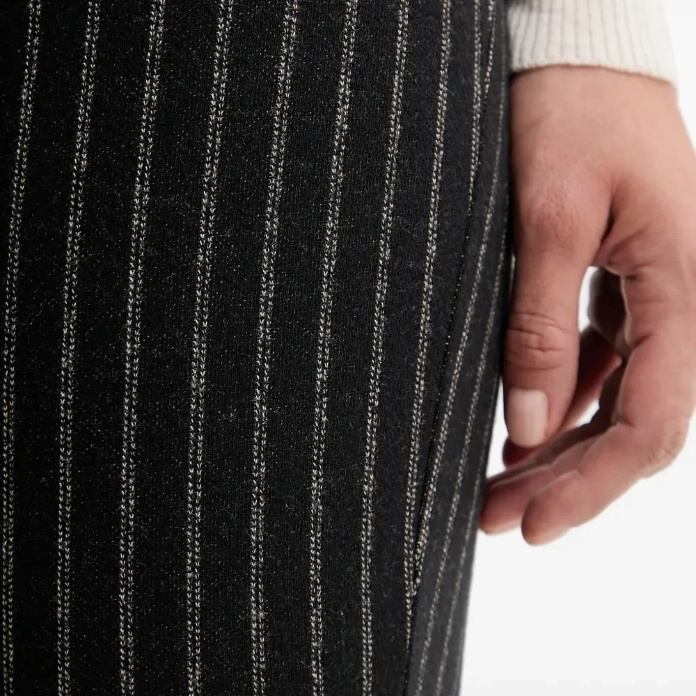 чёрный с полосатым рисунком, расклёшенный подол, прорезные карманы