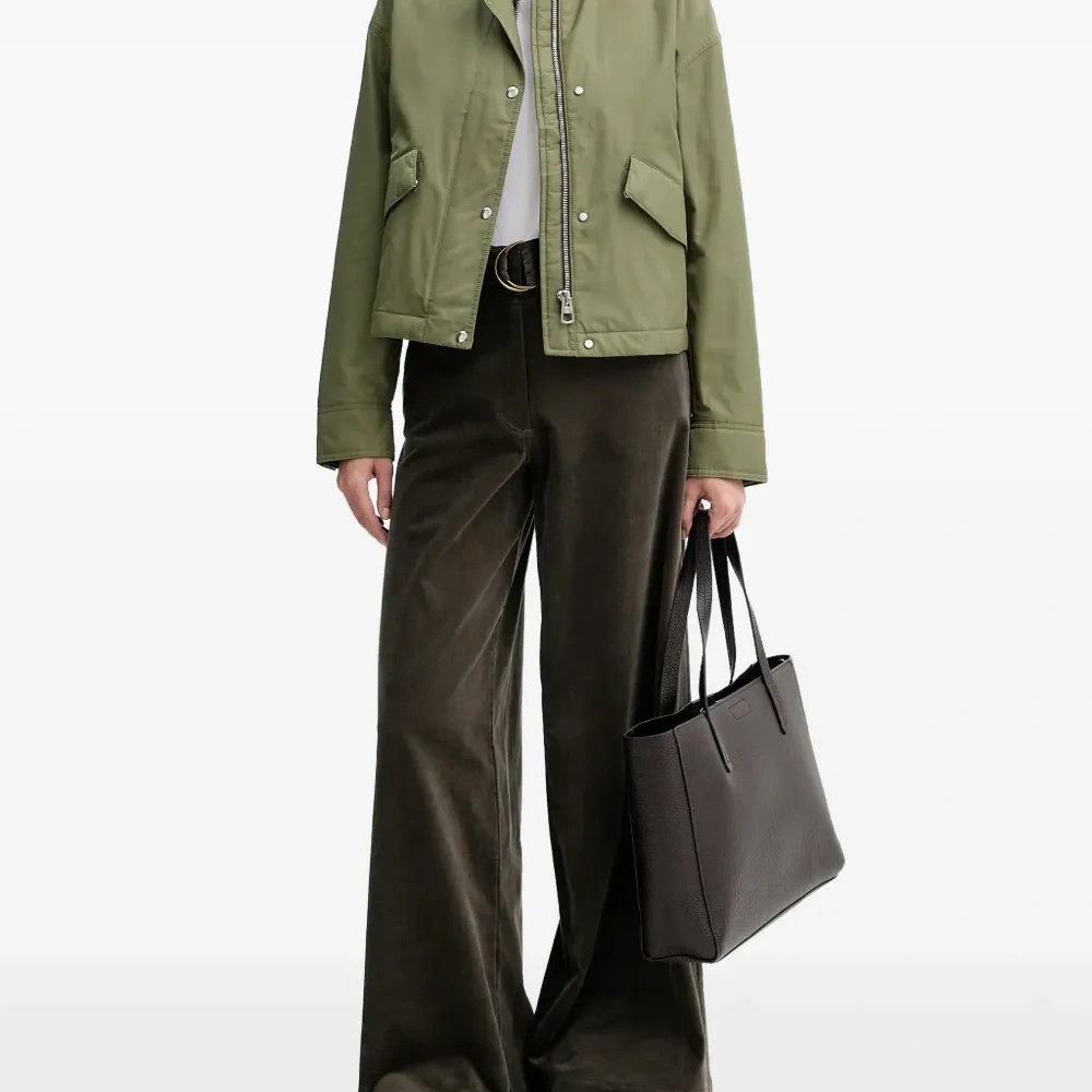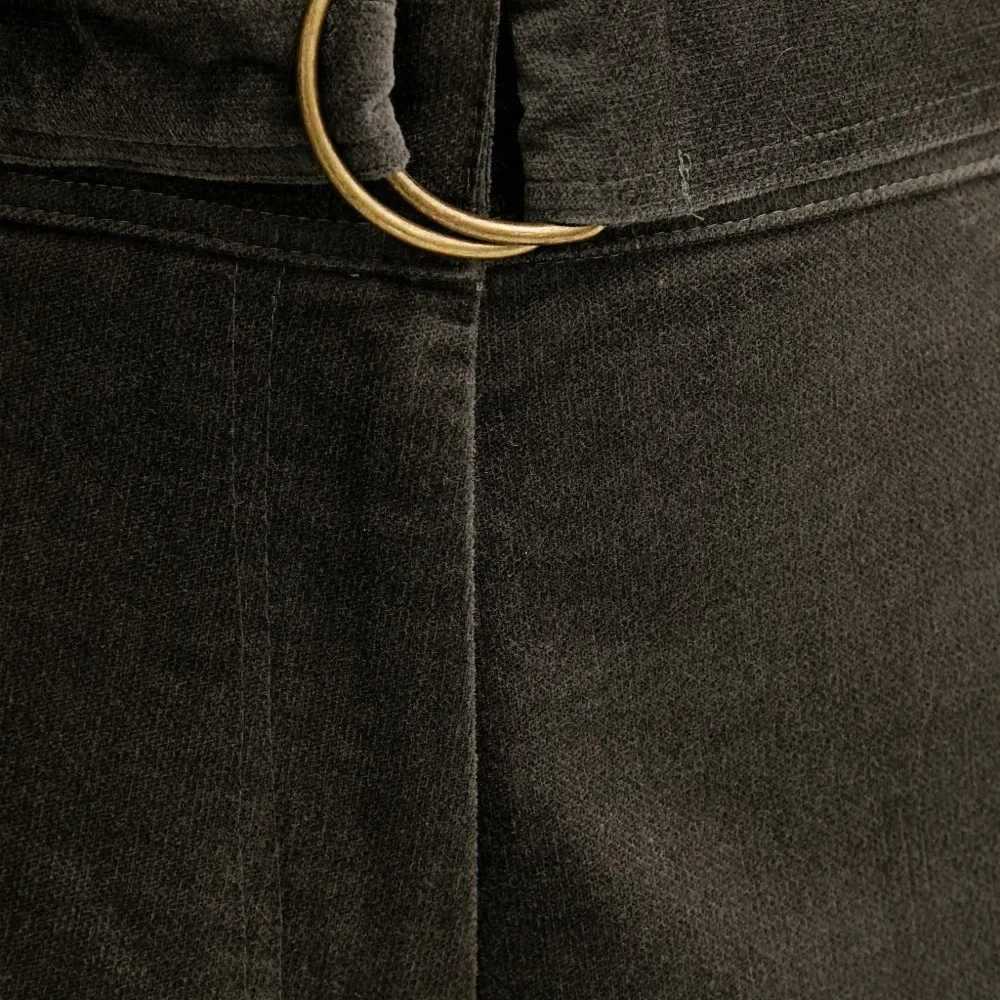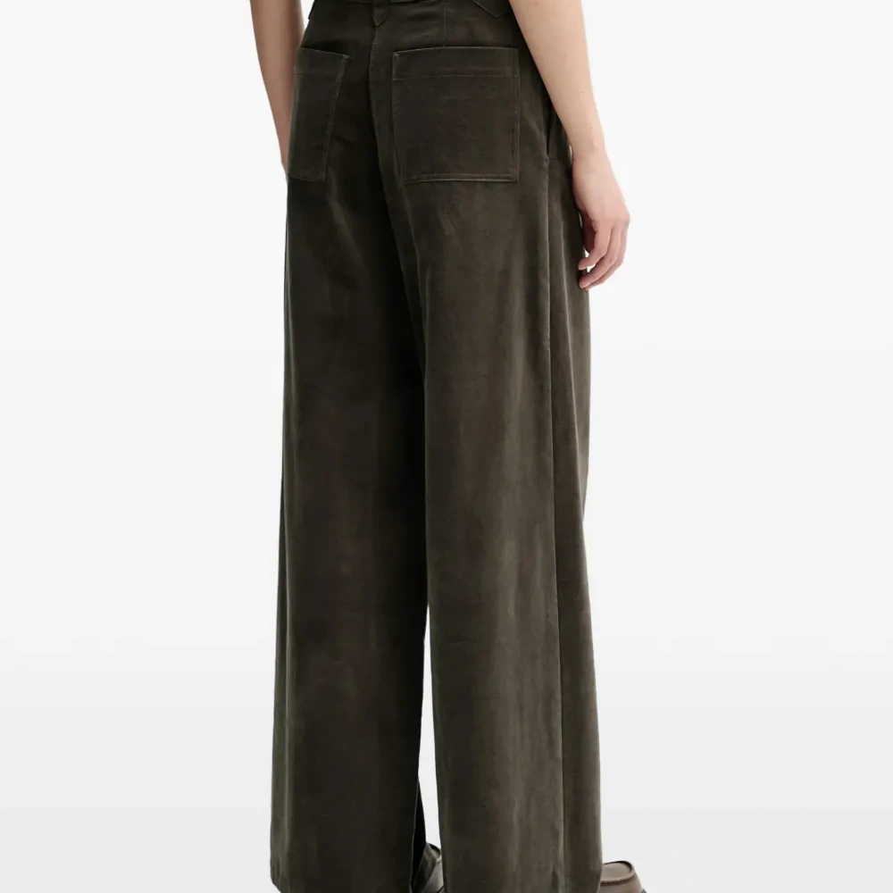 зелёные брюки с пряжкой, накладными карманами, широкими штанинами, шлёвками для ремня и эффектом бархата