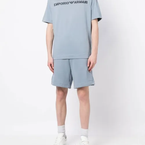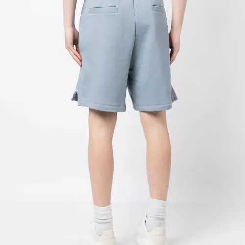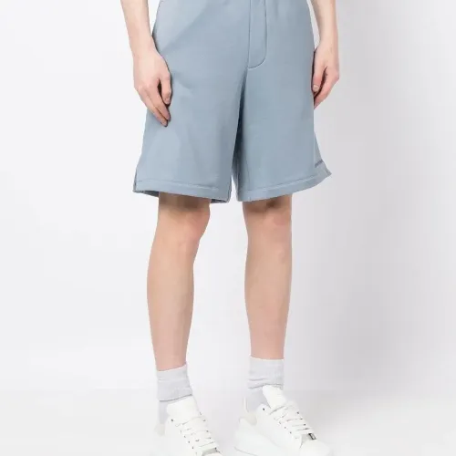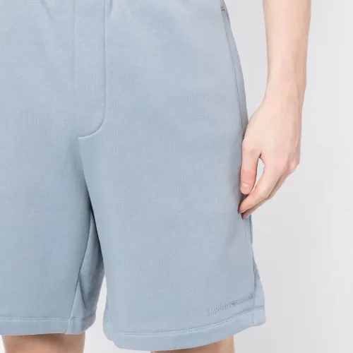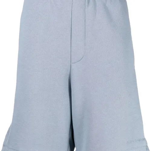 Синий, хлопок, эластичный пояс, прямой подол и два кармана с листочкой сзади.