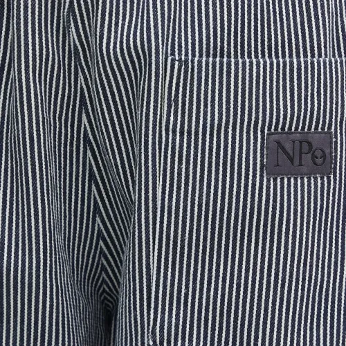 синие брюки в полоску с нашивками, эластичным поясом, задним карманом и боковым карманом