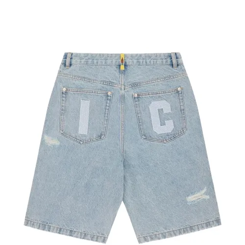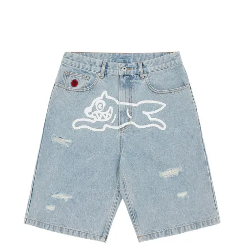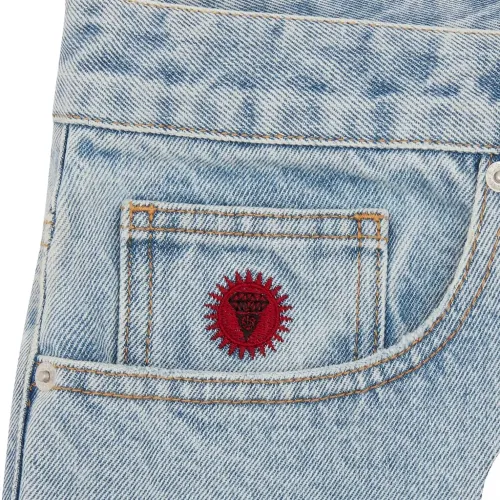 светлый деним, принт бегущей собаки, шлевки для ремня, стиль с пятью карманами, эффект потертости, логотип, застежка на пуговицы