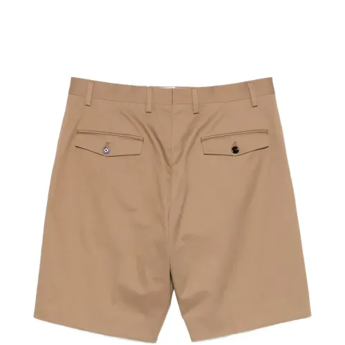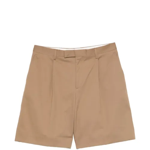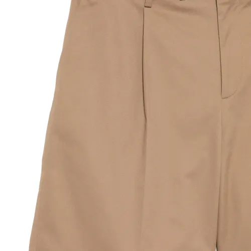 коричневые брюки со складками спереди, шлевками для ремня и двумя прорезными карманами сзади на пуговицах