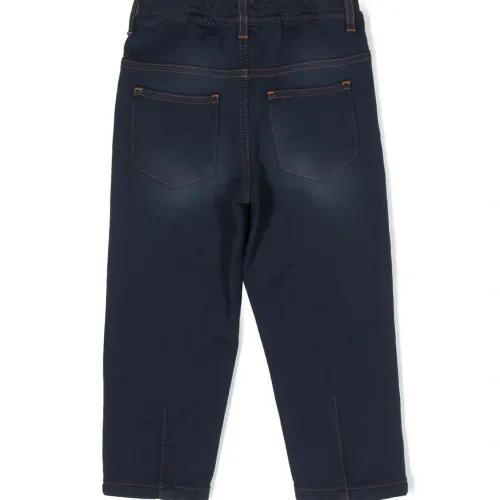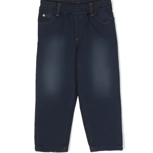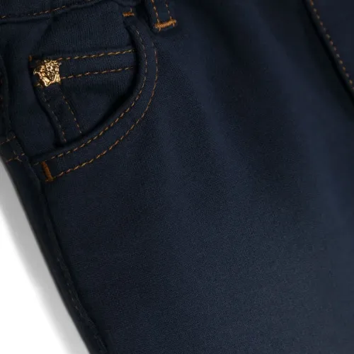 Темно-синий, хлопок, обработанный деним, золотистый металлический логотип, узор Medusa Head, защипы, контрастная строчка, средняя посадка, петли для ремня, прямой крой, эластичный пояс и пять карманов.