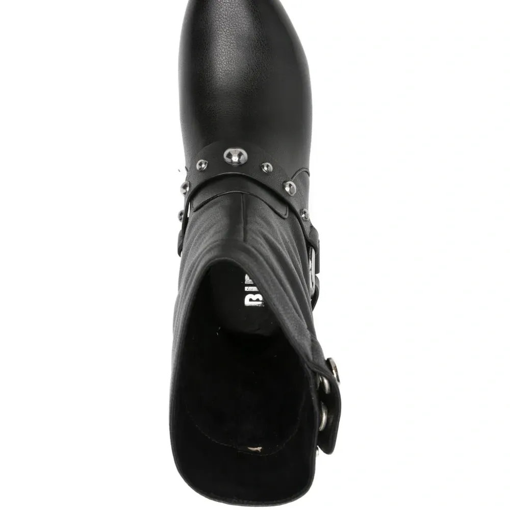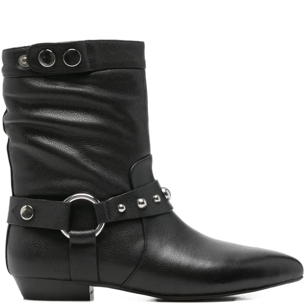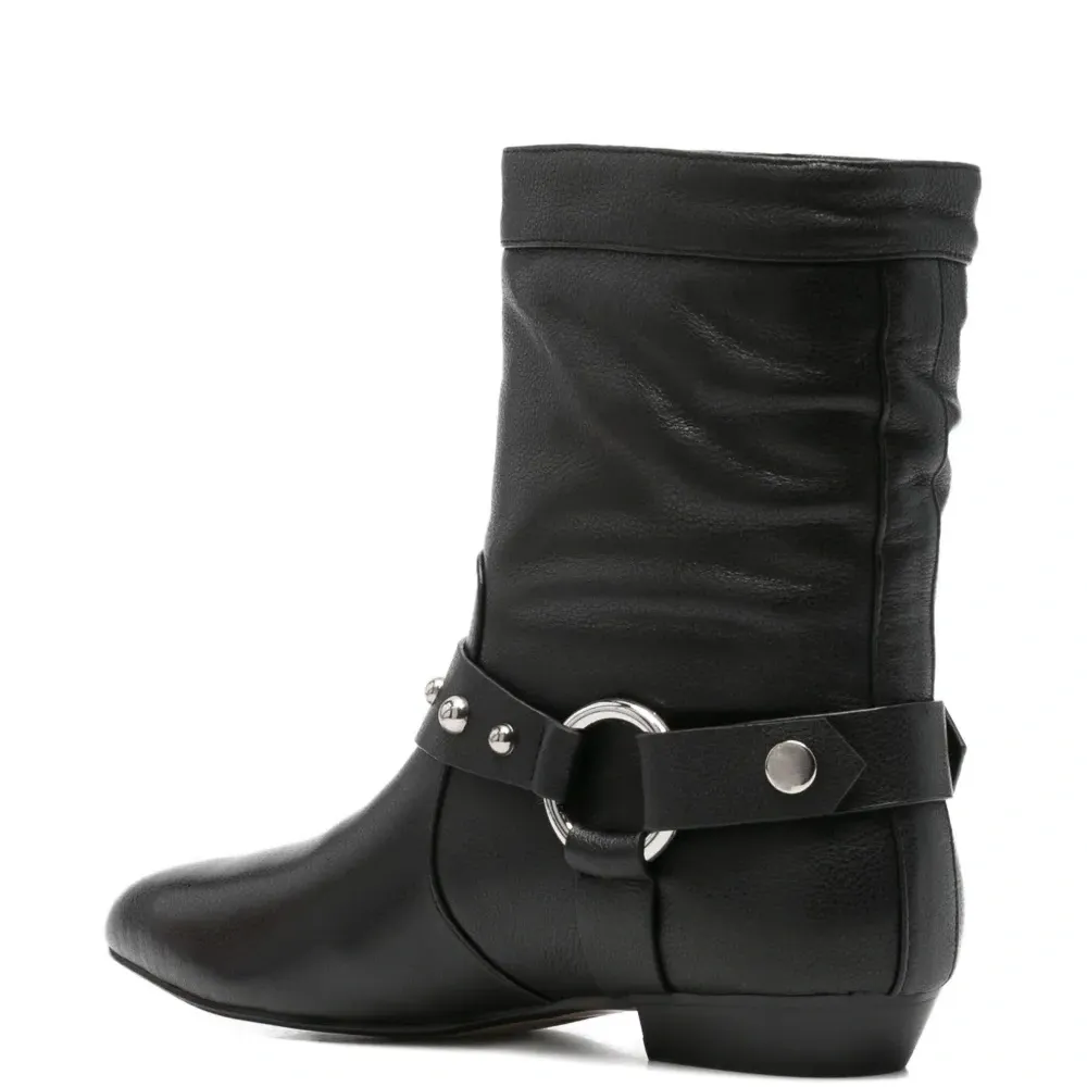 чёрные ботинки с ремнём, серебристые заклёпки, заострённый носок, модель без застёжки, низкий каблук