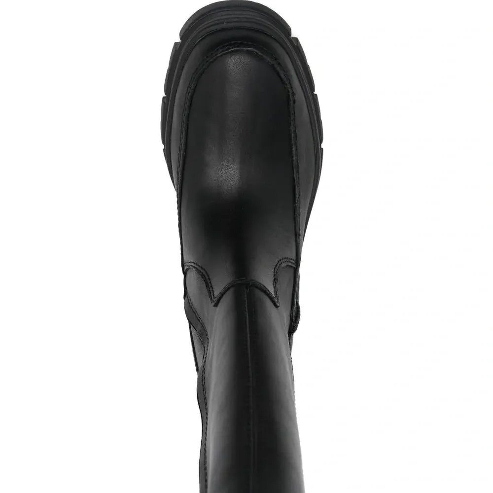 Черный, телячья кожа, тисненый логотип сбоку, закругленный носок, эластичные боковые вставки, застежки на молнии сбоку, низкий каблук и рифленая резиновая подошва.