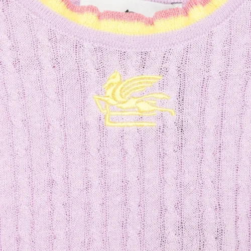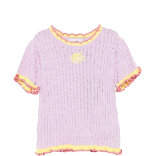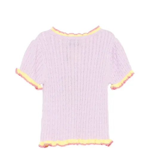 сиреневая блузка с вышивкой, оборками по краю, круглым вырезом и короткими рукавами