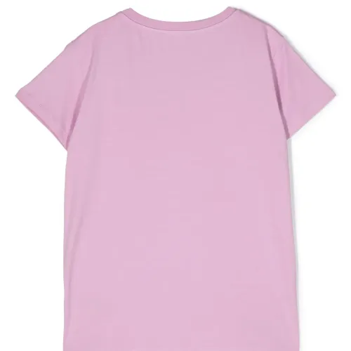 Лиловый, эластичный хлопок, принт с логотипом на груди, застежка на кнопках на плече, круглый вырез, короткие рукава и прямой подол.