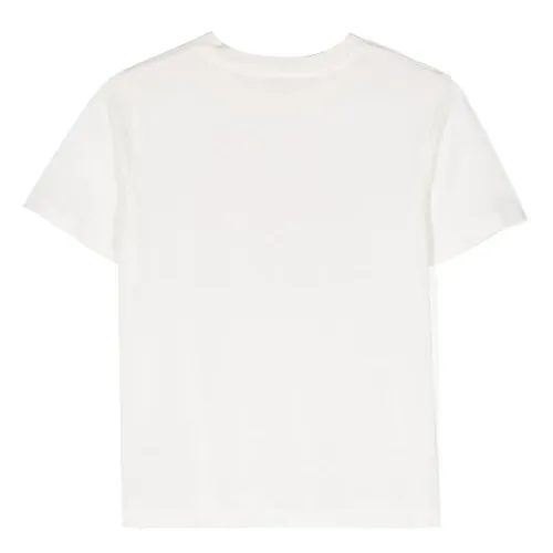 Молочно-белый, хлопок, логотип спереди, круглый вырез, короткие рукава и прямой подол.