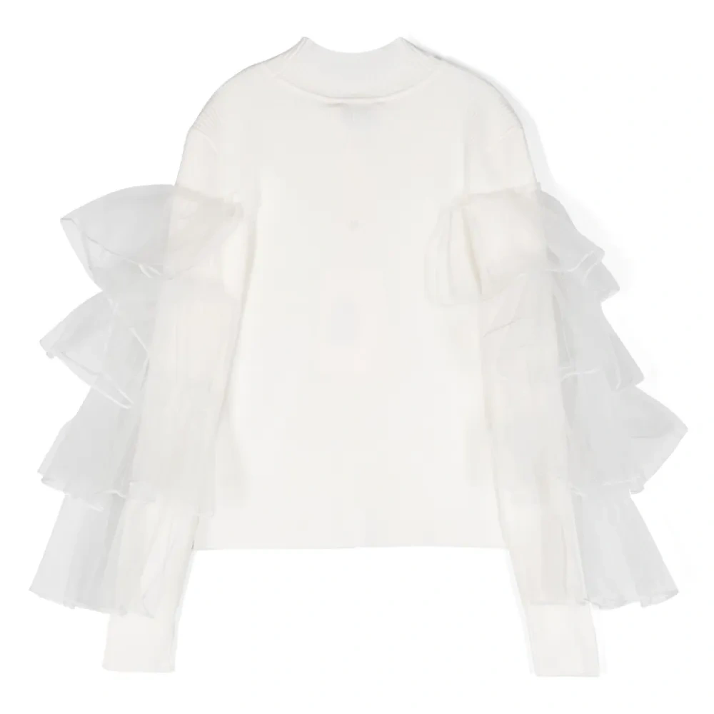 Кремовый, вставки с оборками, высокий воротник, приспущенные плечи, длинные рукава и прямой подол.