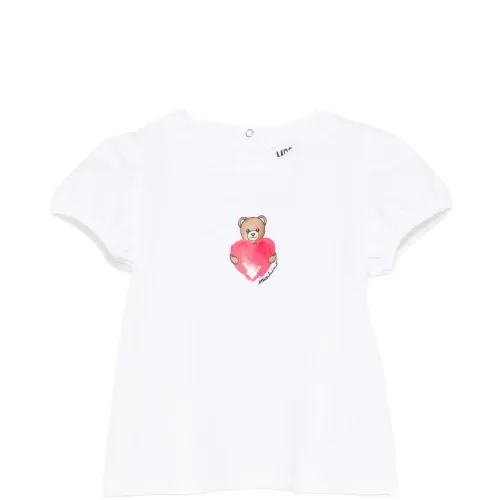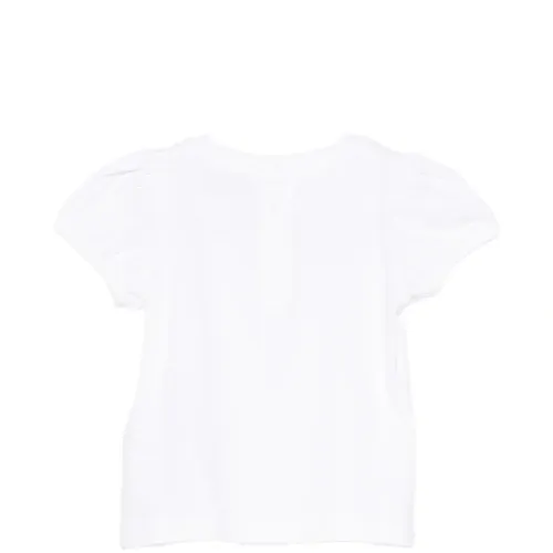 белая футболка с графическим принтом, пышными рукавами, круглым вырезом, короткими рукавами и застежкой на кнопки