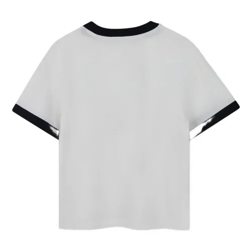 белая футболка с круглым вырезом, короткими рукавами, контрастной отделкой и принтом-надписью