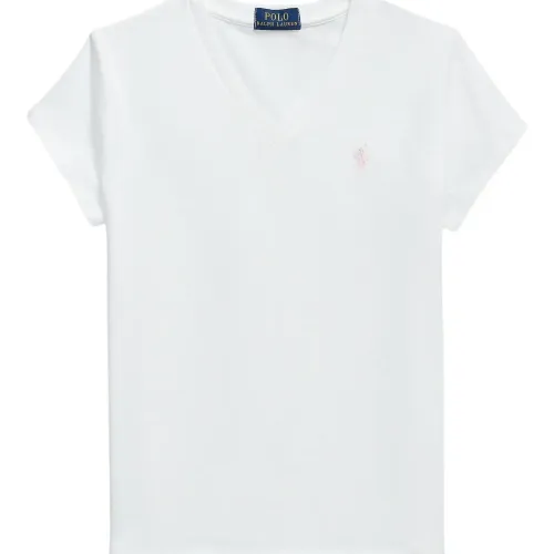 белая футболка с V-образным вырезом, короткими рукавами и вышитым логотипом Polo Pony
