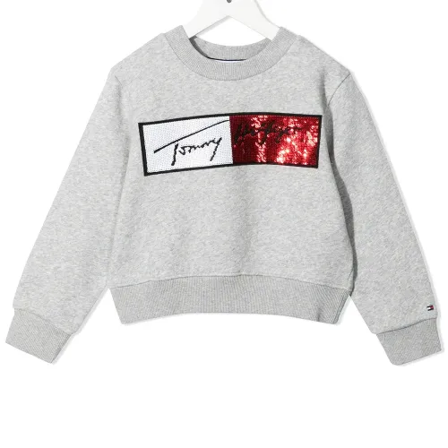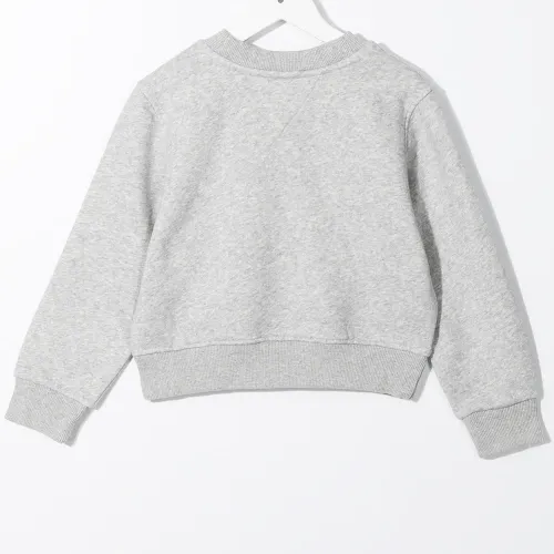 Логотип из пайеток, круглый вырез, длинные рукава и подол в рубчик. Цвет: серый.