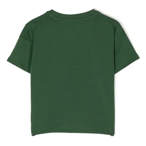 Темно-зеленый, стрейчевый органический хлопок, принт с надписью спереди, круглый вырез, приспущенные плечи, короткие рукава и прямой подол. Узнать больше о том, какие товары получают отметку «Ответственный выбор», можно из материала «Как мы оцениваем экологичность и этичность».