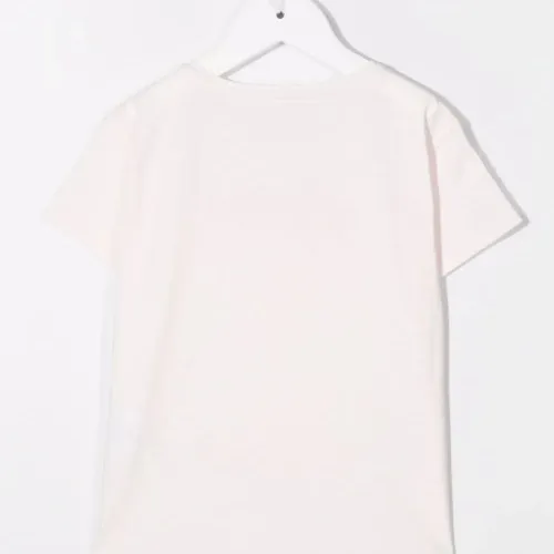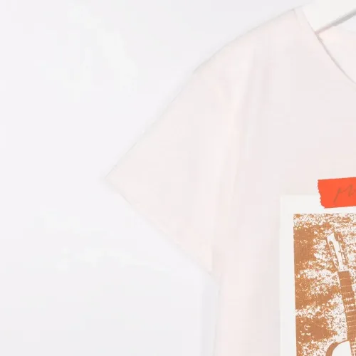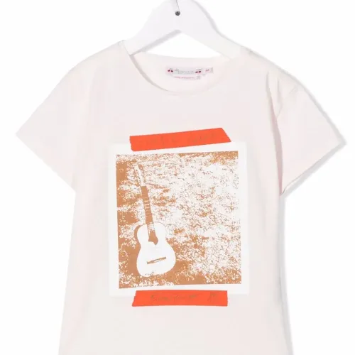Ткань джерси, графичный принт спереди, круглый вырез, короткие рукава и закругленный подол.