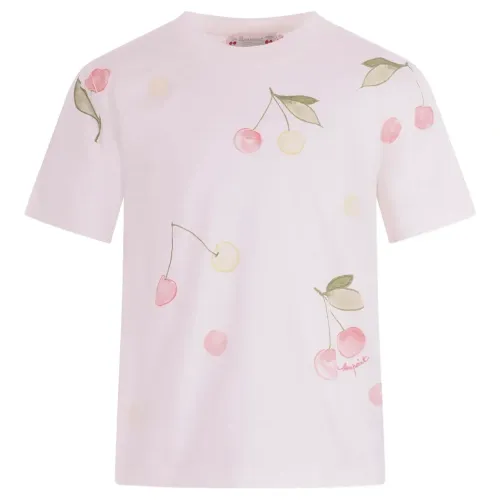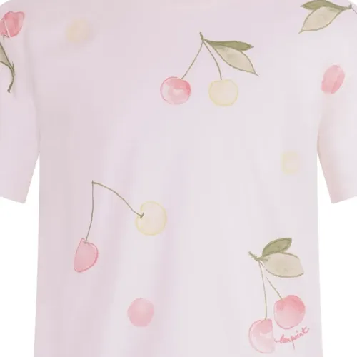 белая футболка с принтом вишен, круглым вырезом и короткими рукавами