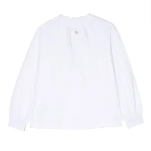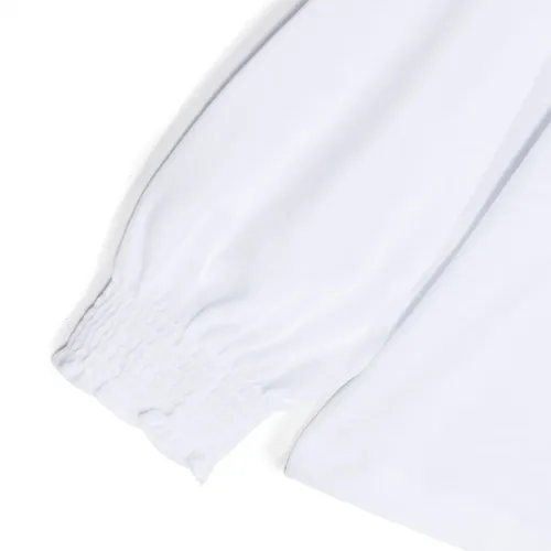 Белый, хлопок, детали с оборками, высокий воротник, длинные широкие рукава, эластичные манжеты и прямой подол.