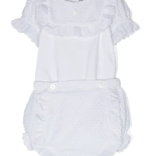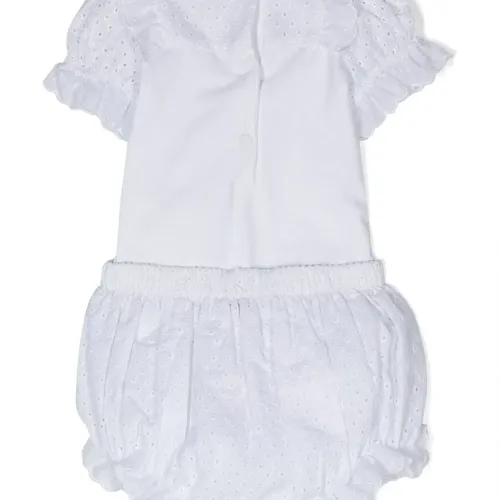 Английская вышивка, вставки с оборками, английская вышивка, декоративные пуговицы и эластичный пояс.