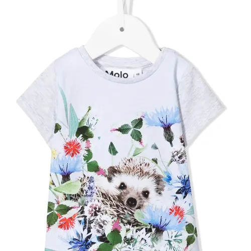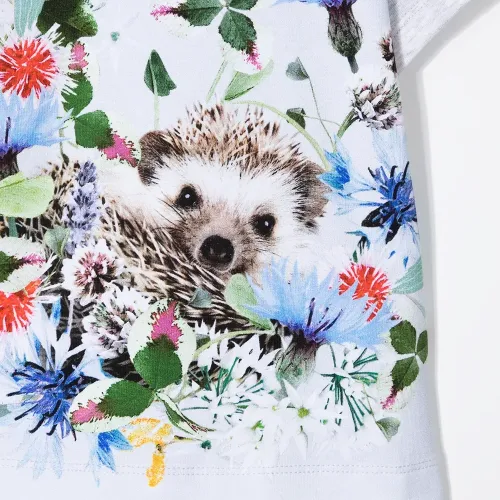 Ткань джерси, принт с изображением растений, круглый вырез, короткие рукава и прямой подол. .