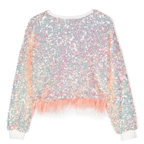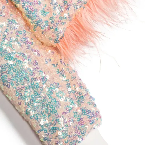 Персиково-розовый, переливающийся, украшение из пайеток, перья, круглый вырез, длинные рукава и прямой подол. Узнать больше о том, какие товары получают отметку «Ответственный выбор», можно из материала «Как мы оцениваем экологичность и этичность».