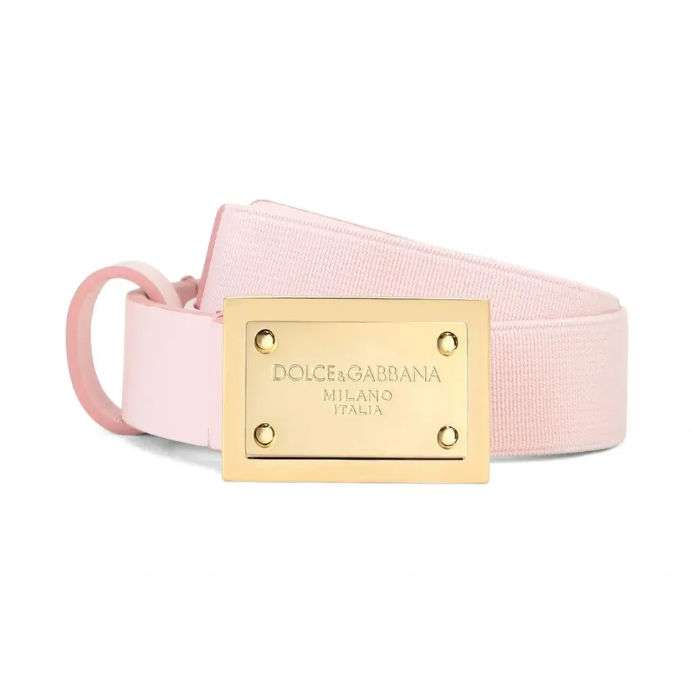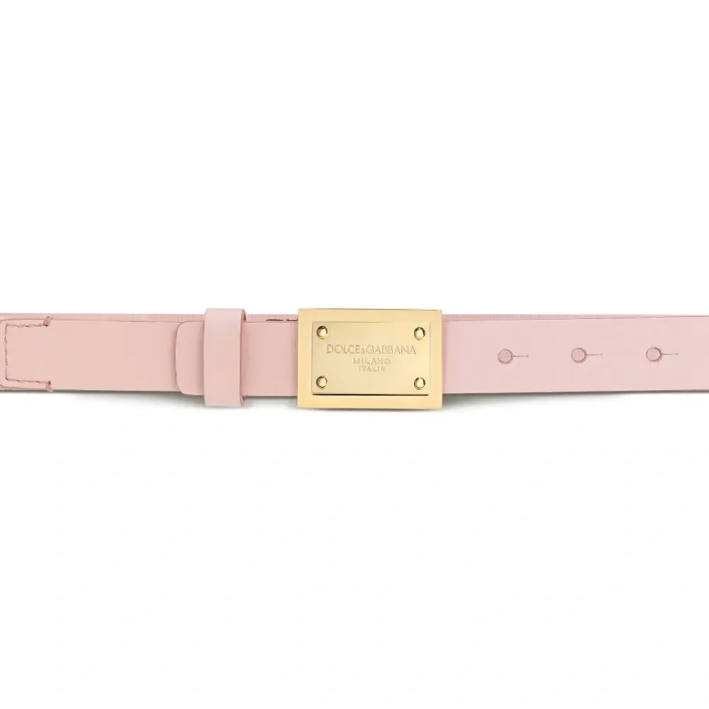 Светло-розовый, телячья кожа, глянцевая фактура, золотистый металлический логотип, застежка на пряжке с логотипом, прорезанные отверстия и регулируемый дизайн.
