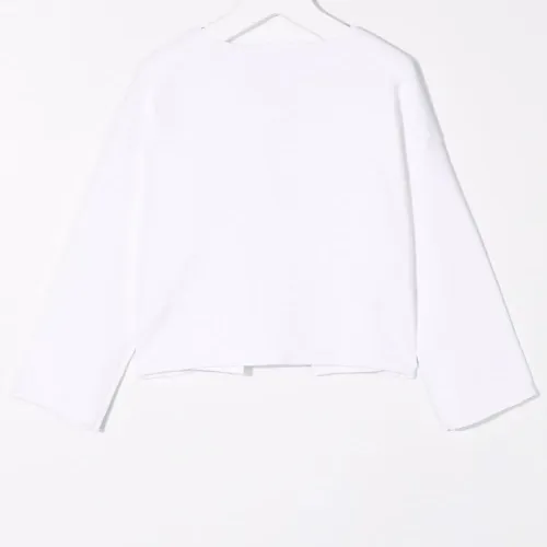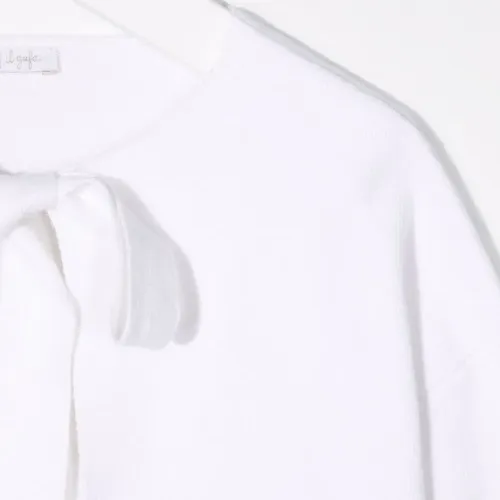 Тонкая вязка, круглый вырез, бант спереди, длинные рукава и прямой подол. Цвет: белый.