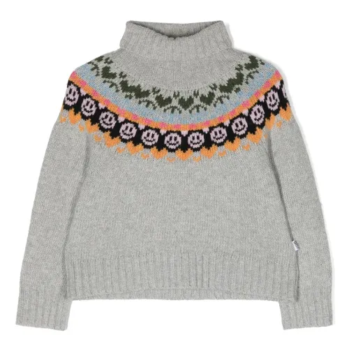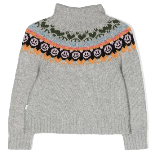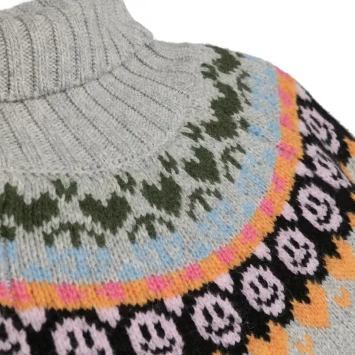 Пепельно-серый, разноцветный, смесовая шерсть, узор в виде смайла, вязка в технике интарсия, высокий воротник, длинные рукава и прямой подол. Узнать больше о том, какие товары получают отметку «Ответственный выбор», можно из материала «Как мы оцениваем экологичность и этичность».