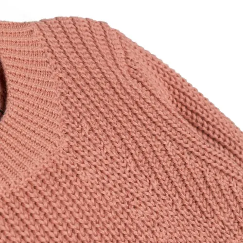 Кораллово-розовый, кроше, воротник-стойка в рубчик, длинные рукава и прямой подол. Узнать больше о том, какие товары получают отметку «Ответственный выбор», можно из материала «Как мы оцениваем экологичность и этичность».