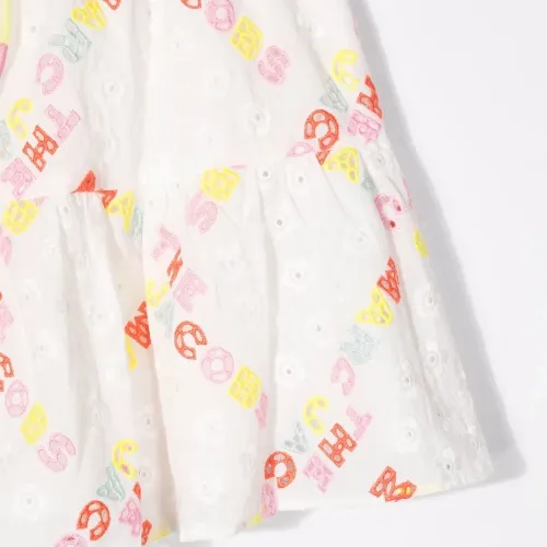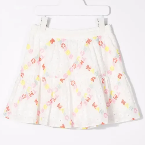 Английская вышивка, вышитые логотипы, эластичный пояс, А-образный силуэт, ярусная юбка, закругленный подол и длина до бедер.