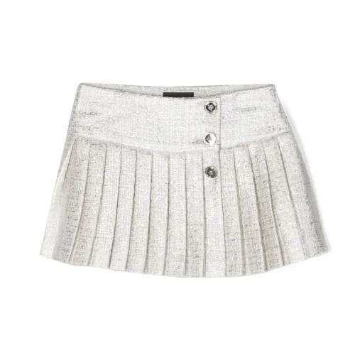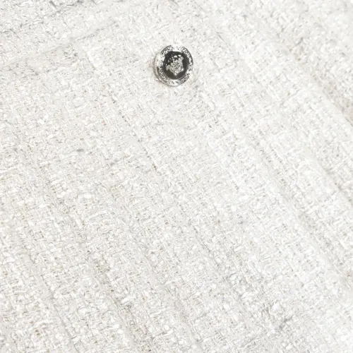 Белый, серебристый, твидовая ткань, серебристые пуговицы с тиснением, плиссированная модель и прямой подол.