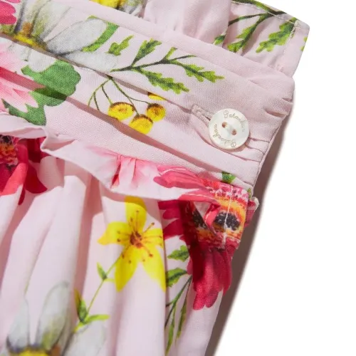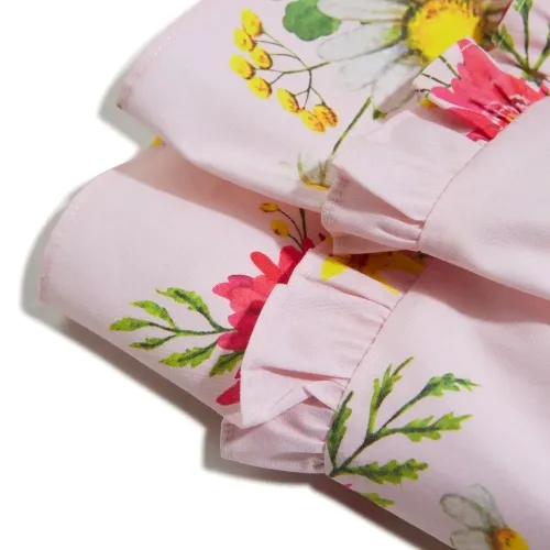 Светло-розовый, разноцветный, хлопок, вставки с оборками, сплошной цветочный принт, средняя посадка и пуговичная застежка сбоку.