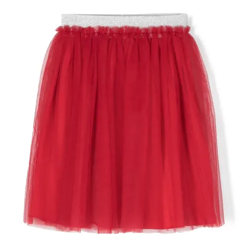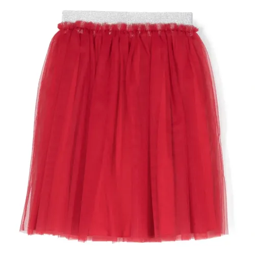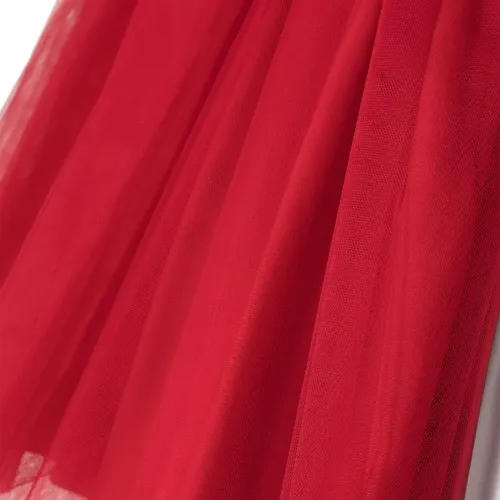 Красный, эластичный пояс, блестящий материал, верхний слой из тюля и модель без застежки.