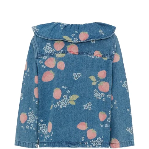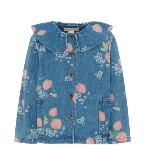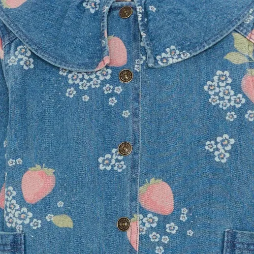 джинсовая синяя рубашка с принтом клубники, отложным воротником, застёжкой на пуговицы спереди и накладными карманами
