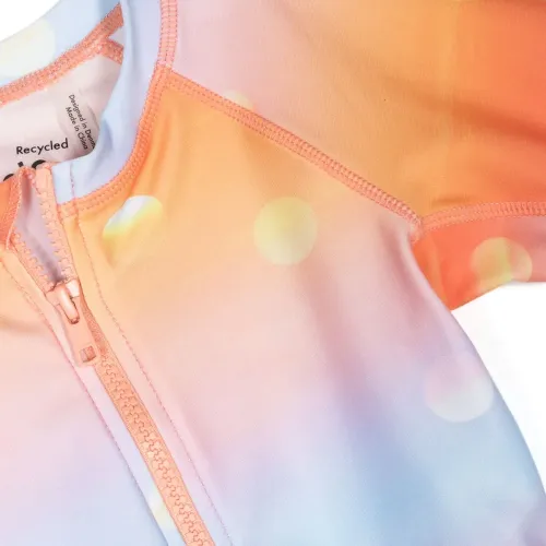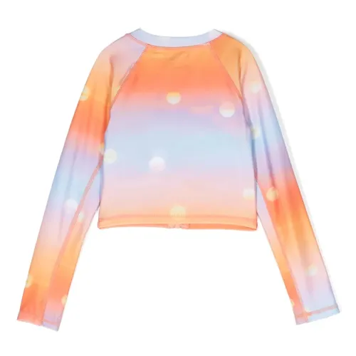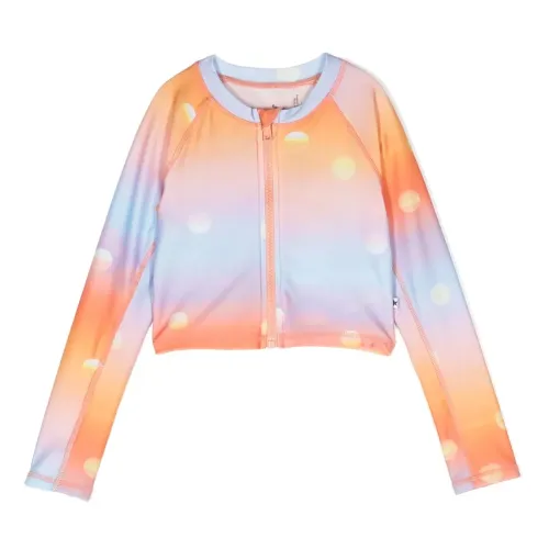 Оранжевый, голубой, смесовый переработанный полиэстер, градиентный эффект, принт в горох, воротник-стойка, застежка на молнии спереди и длинные рукава. Узнать больше о том, какие товары получают отметку «Ответственный выбор», можно из материала «Как мы оцениваем экологичность и этичность».
