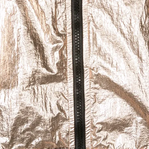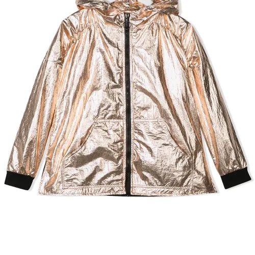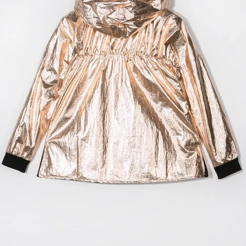 Куртка с капюшоном и эффектом металлик от Andorine. Металлический отблеск, капюшон, застежка на молнии спереди, длинные рукава, свободный крой и два передних кармана.