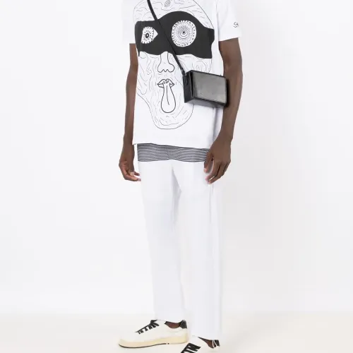 Белый/черный, принт в горизонтальную полоску, прямой крой, эластичный пояс, два прорезных кармана по бокам, задние карманы с листочкой и подол с кулиской.