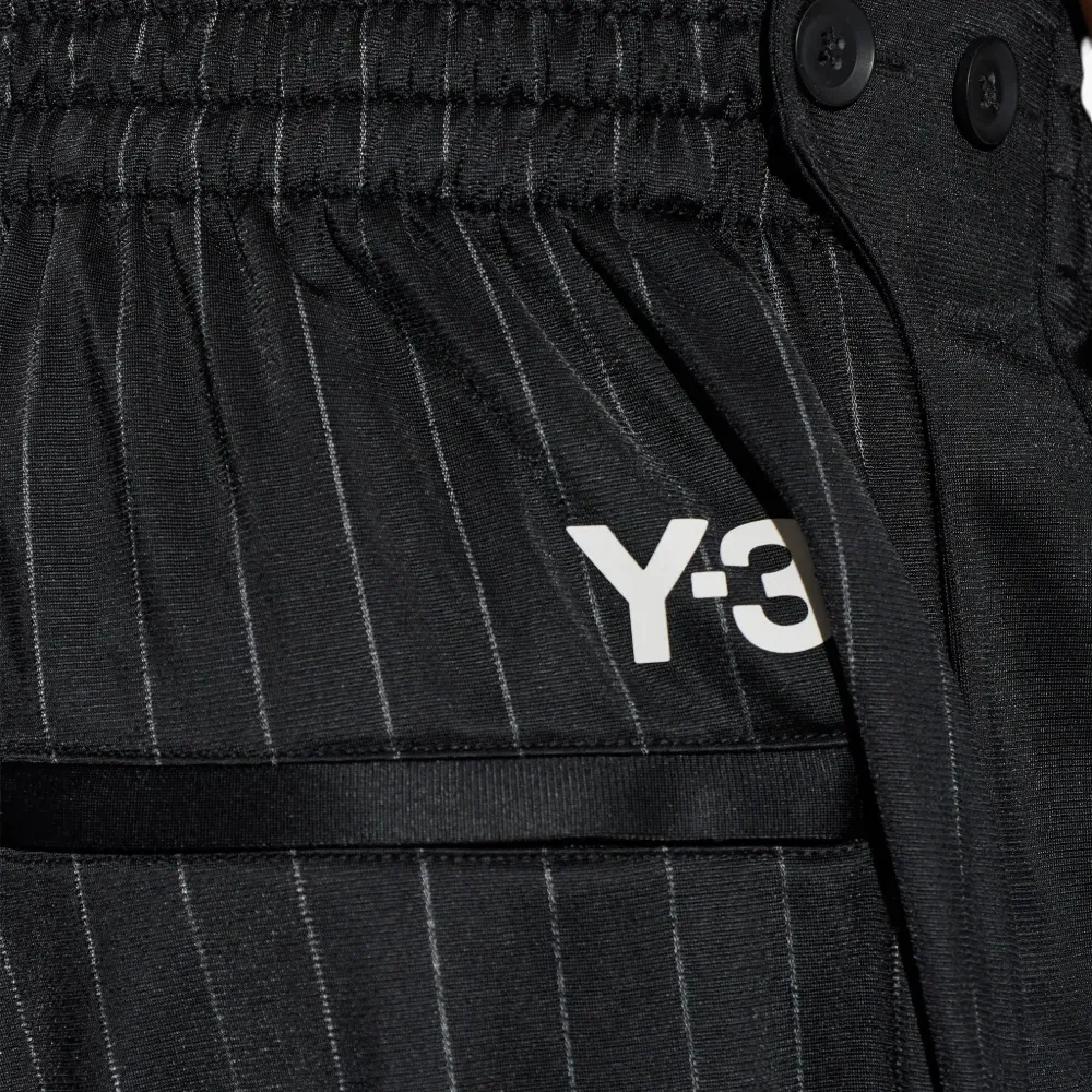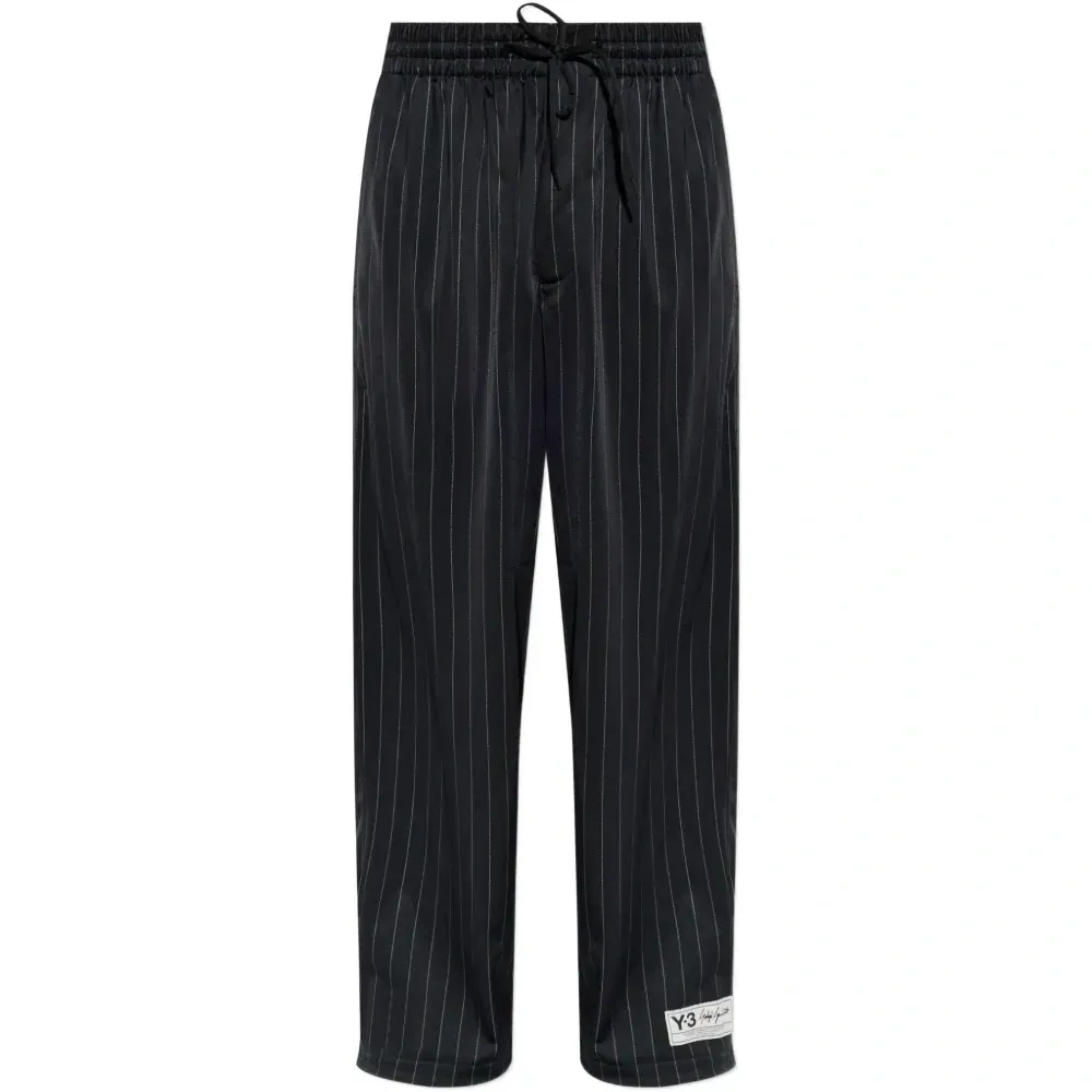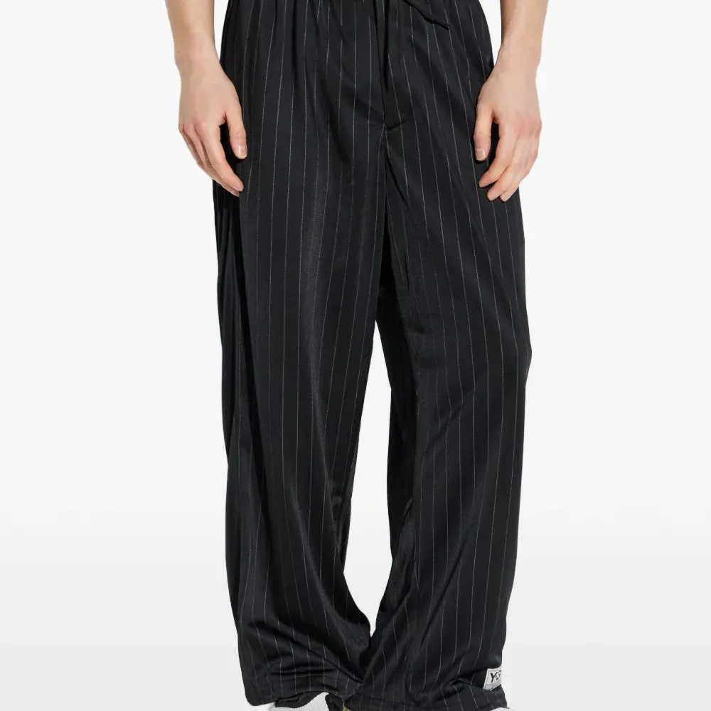 черные брюки в тонкую полоску, эластичный пояс со шнурком, боковые карманы, логотип