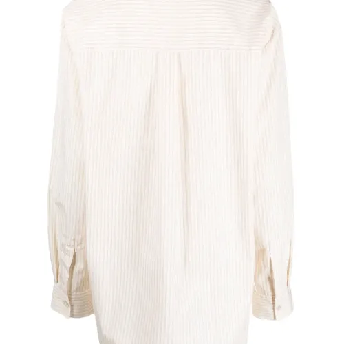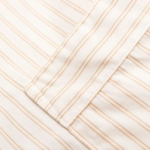Кремово-белый, бежевый, органический хлопок, узор в вертикальную полоску, без воротника, нагрудный накладной карман, застежка на пуговицах спереди, длинные рукава и прямой подол. Узнать больше о том, какие товары получают отметку «Ответственный выбор», можно из материала «Как мы оцениваем экологичность и этичность».