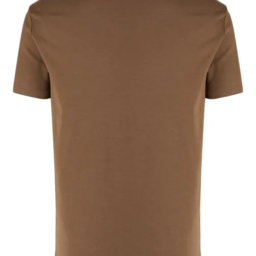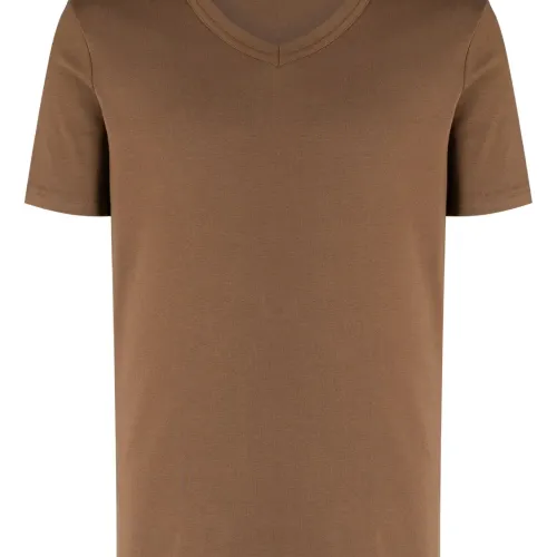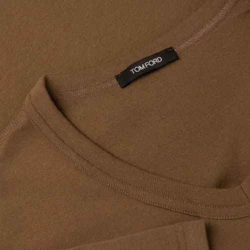 Коньячный коричневый, эластичный хлопок, V-образный вырез, короткие рукава и прямой подол.