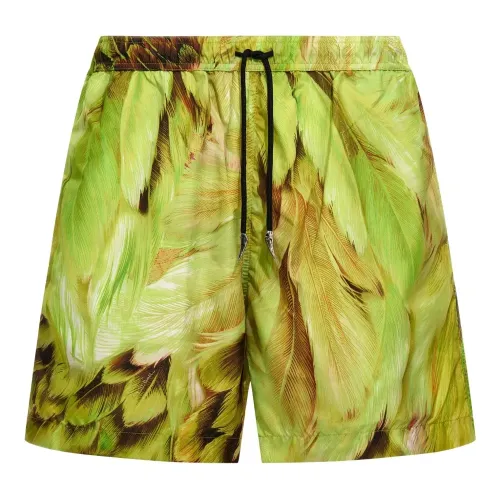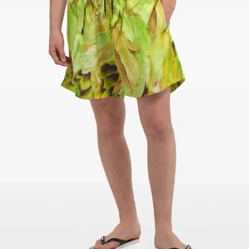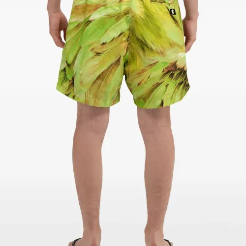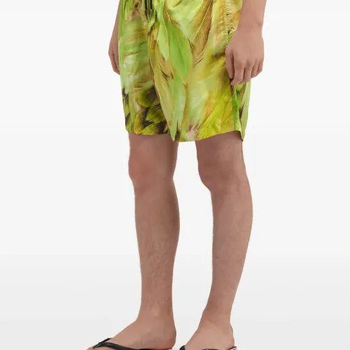 зелёные плавки с принтом "перо", эластичным поясом на завязках, боковыми карманами и подвеской с логотипом. Пожалуйста, примерьте купальники поверх вашего собственного нижнего белья.