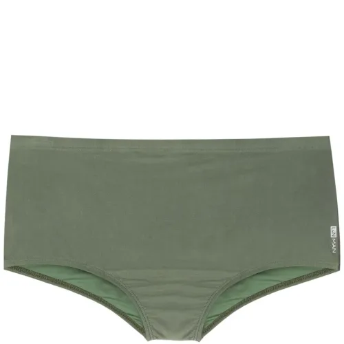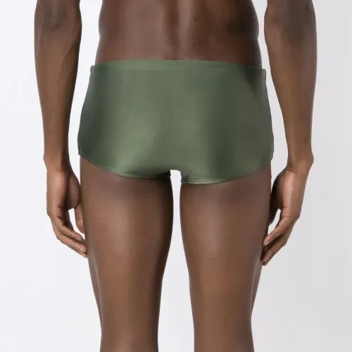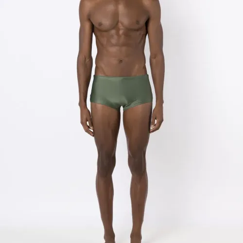Оливково-зеленый, эластичный материал, логотип сбоку и эластичный пояс. Пожалуйста, примеряйте купальники и пляжные шорты только поверх собственного белья.
