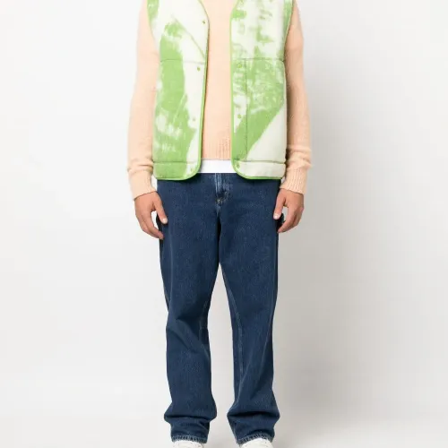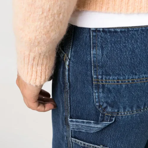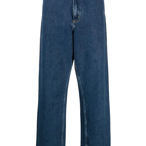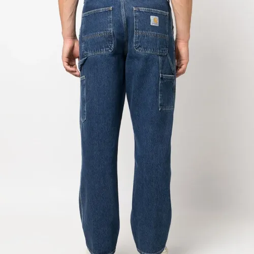 Индиго, хлопок, деним, прямой крой, петли для ремня, средняя посадка, потайная застежка на молнии и пуговицах, нашивка с логотипом сзади и пять карманов.