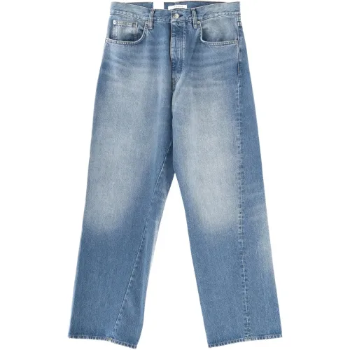 синие джинсы с эффектом потертости, пятью карманами, отделкой швов и прямыми штанинами