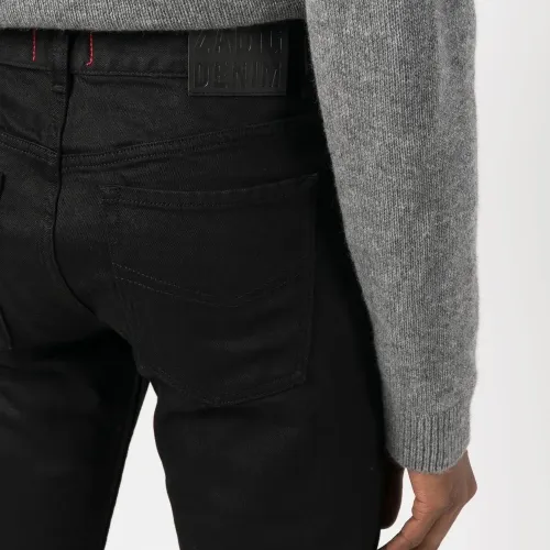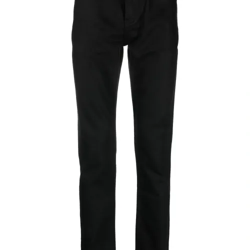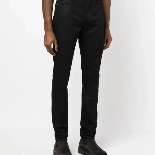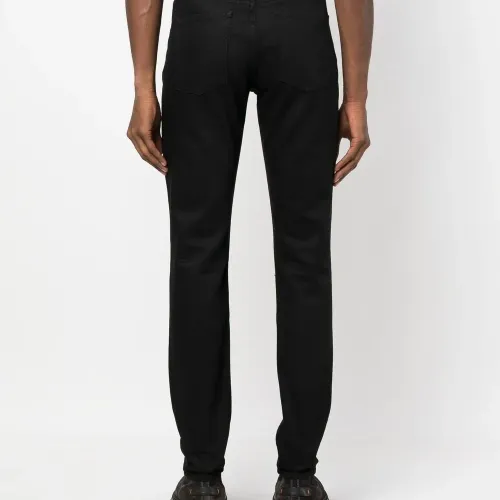 Черный, смесовый хлопок, деним, нашивка с логотипом сзади, петли для ремня, застежка на молнии и пуговице спереди, пять карманов и прямой крой.
