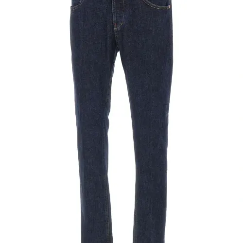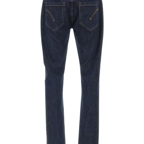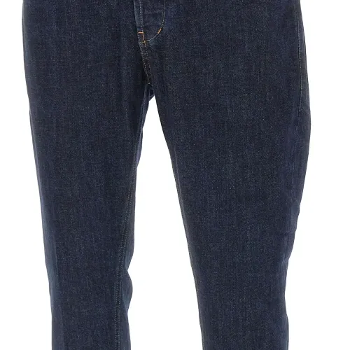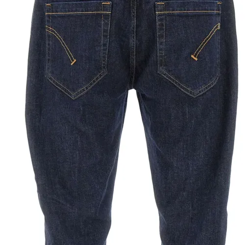 темно-синий цвет, оранжевая строчка, пять карманов, шлевки для ремня, застежка на пуговицу с логотипом, металлическая деталь с логотипом