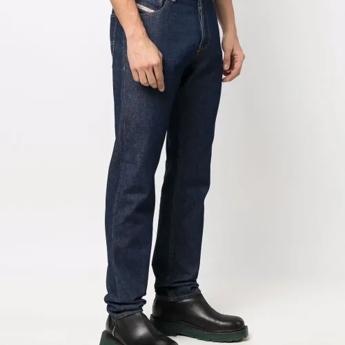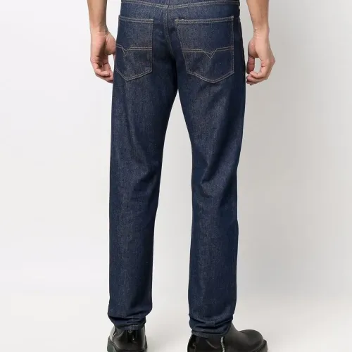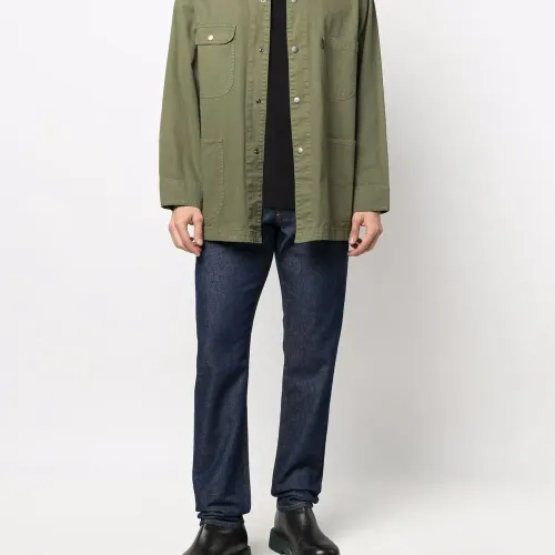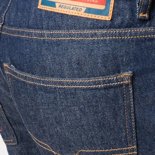 Прямой крой, застежка на пуговицы, петли для ремня и классическая пятикарманная модель.