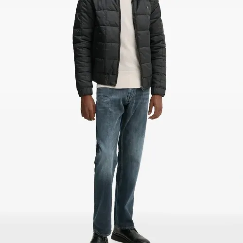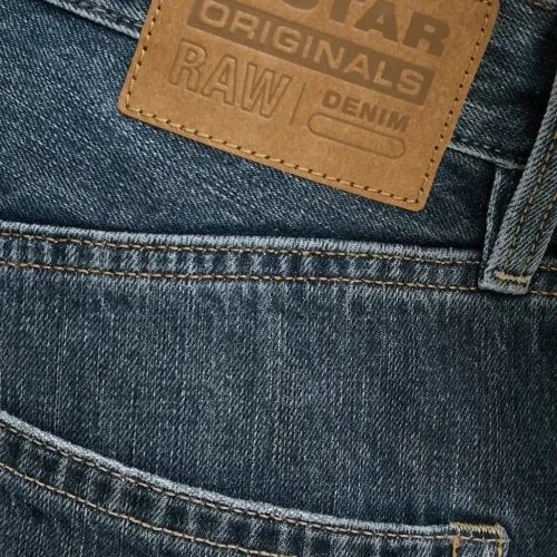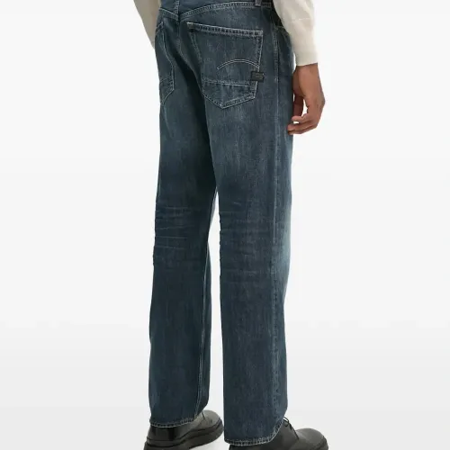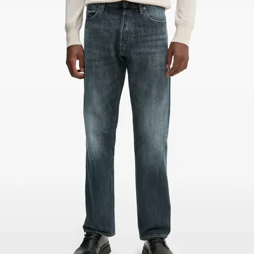 синие джинсы с застежкой на пуговицах, пятью карманами, шлевками для ремня и нашивкой с логотипом сзади